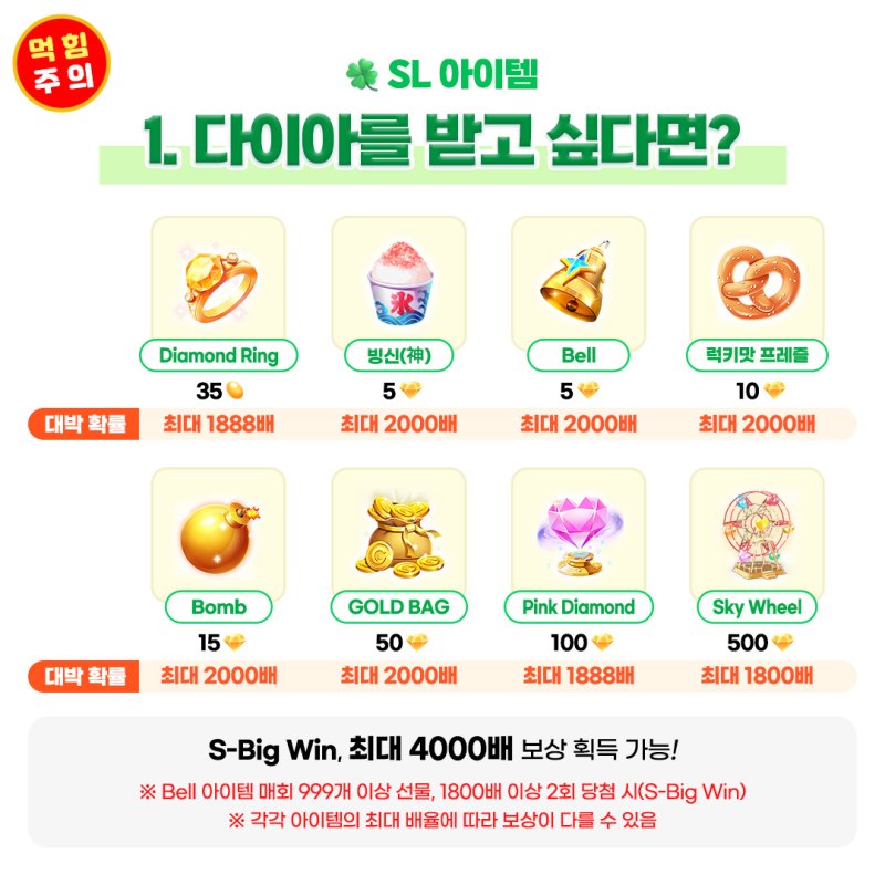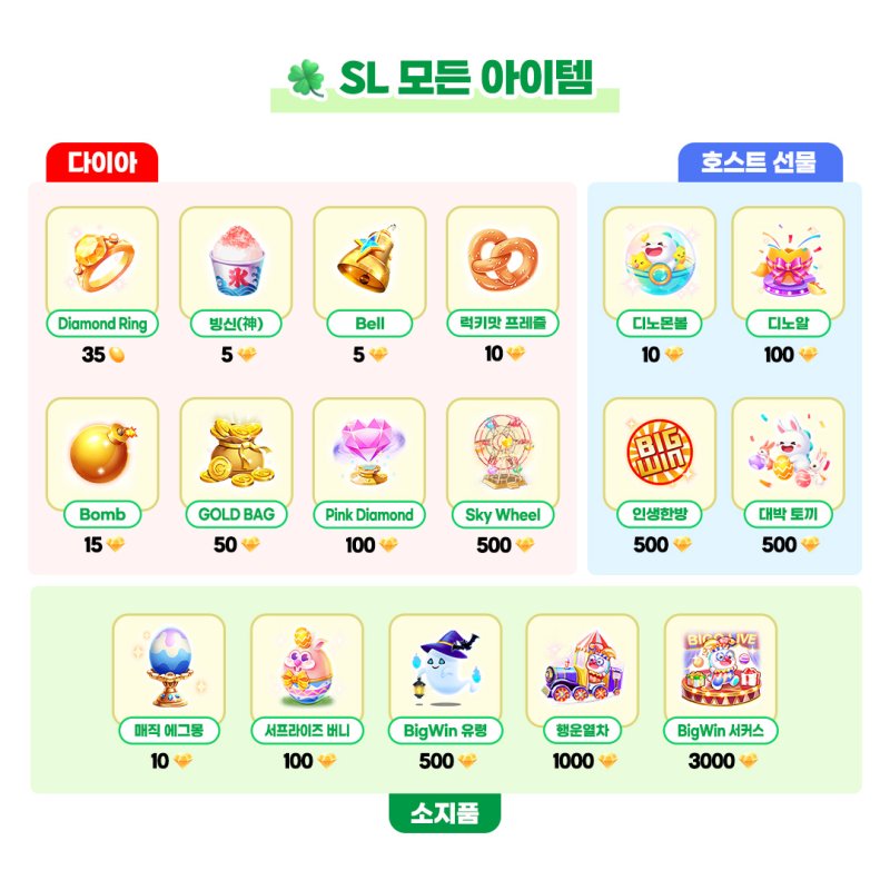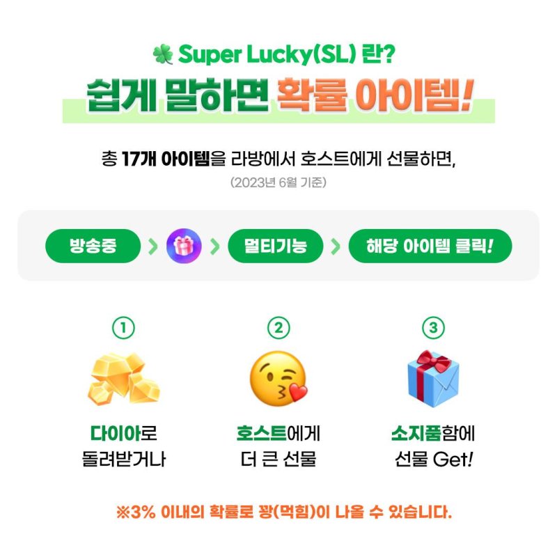 SL 아이템을 이해하면 희노애락을 함께하며 긴장감 있고 즐거운 방송을 할 수 있습니다. 예를 들어, 500개짜리 선물을 받았는데 30000개짜리 선물로 돌아올 때 호스트에게 환전 가능한 실제 다이아로 지급되기 때문에 서로가 윈윈하며 기쁠 수밖에 없습니다. 반대로 3000개짜리 아이템을 던졌는데 더 적은 아이템이 나올 경우도 있으므로 다운되는 분위기를 다시 바꿔야 하겠죠?