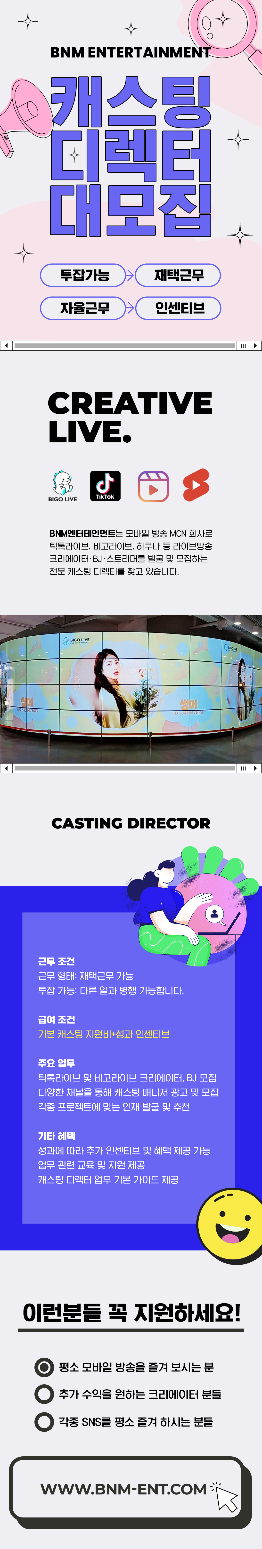 BNM 엔터테인먼트는 틱톡라이브, 비고라이브 크리에이터 및 BJ를 모집하는 전문 캐스팅 디렉터를 찾고 있습니다. 캐스팅 디렉터로서 팀에 합류하여 재능 있는 크리에이터들을 발굴하고 지원하는 역할을 담당하게 됩니다.